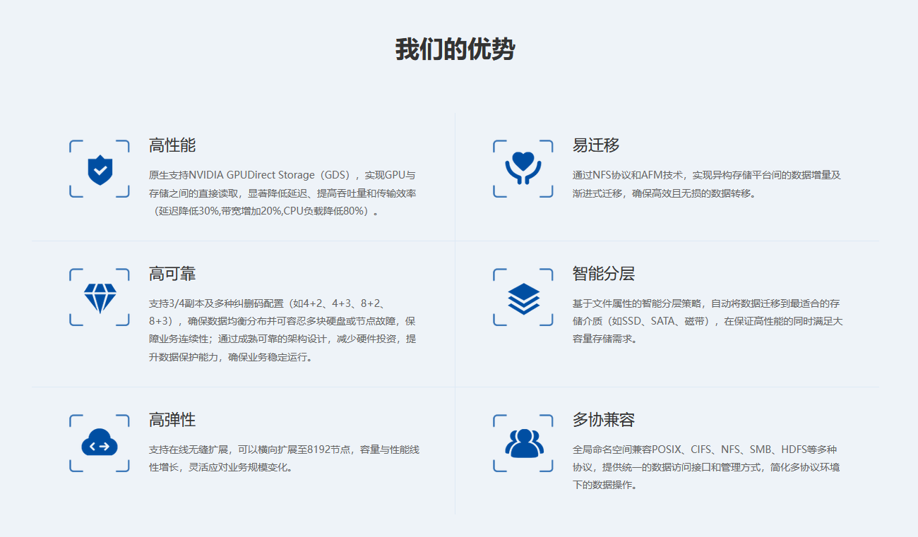 高性能分布式存儲(chǔ)解決方案滿足大模型訓(xùn)推場景和高性能計(jì)算場景對存儲(chǔ)的高性能、高可靠、高彈性、易遷移、智能分層及多協(xié)兼容的需求。